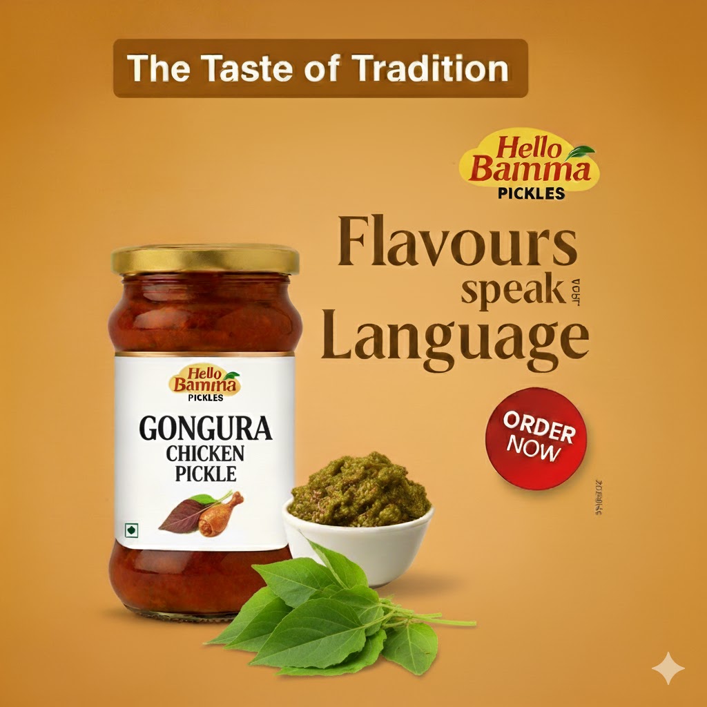 Taste the bold and authentic flavors of Telangana with our Gongura Chicken Pickle. Made using soft, juicy chicken pieces and fresh gongura (sorrel) leaves, blended with traditional home-ground spices and preserved in pure cold-pressed oil.
